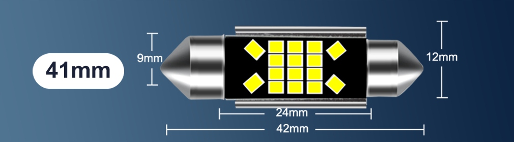 Pasuje w popularne gniazdo C5W w wersji o długości 41mm – zazwyczaj stosowane jako oświetlenie tablicy rejestracyjnej, wnętrze samochodu.